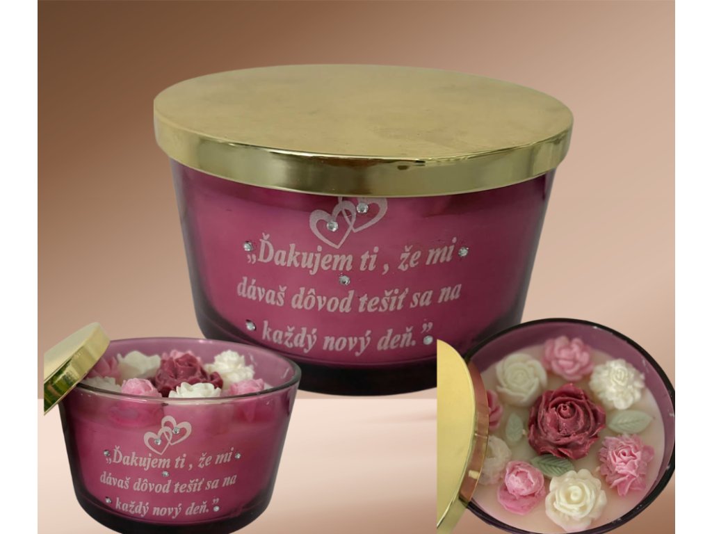 Luxusná gravírovaná sviečka v skle s venovaním Ďakujem Ti zdobená kamienkami a kvetmi s vosku . Sójový vosk . Zabalená v krásnom saténovom vrecúšku .