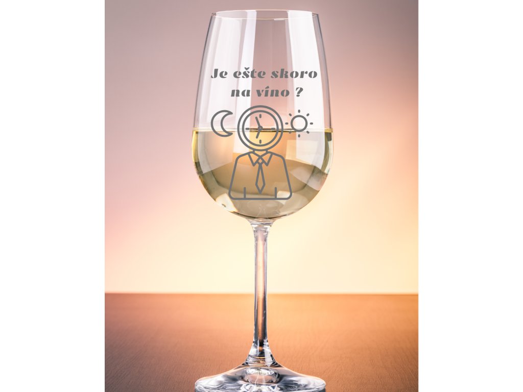Vtipný gravírovaný pohár na víno. Je ešte skoro na víno ? text je gravírovaný do skla . Pohár zabalený v darčekovej krabici .