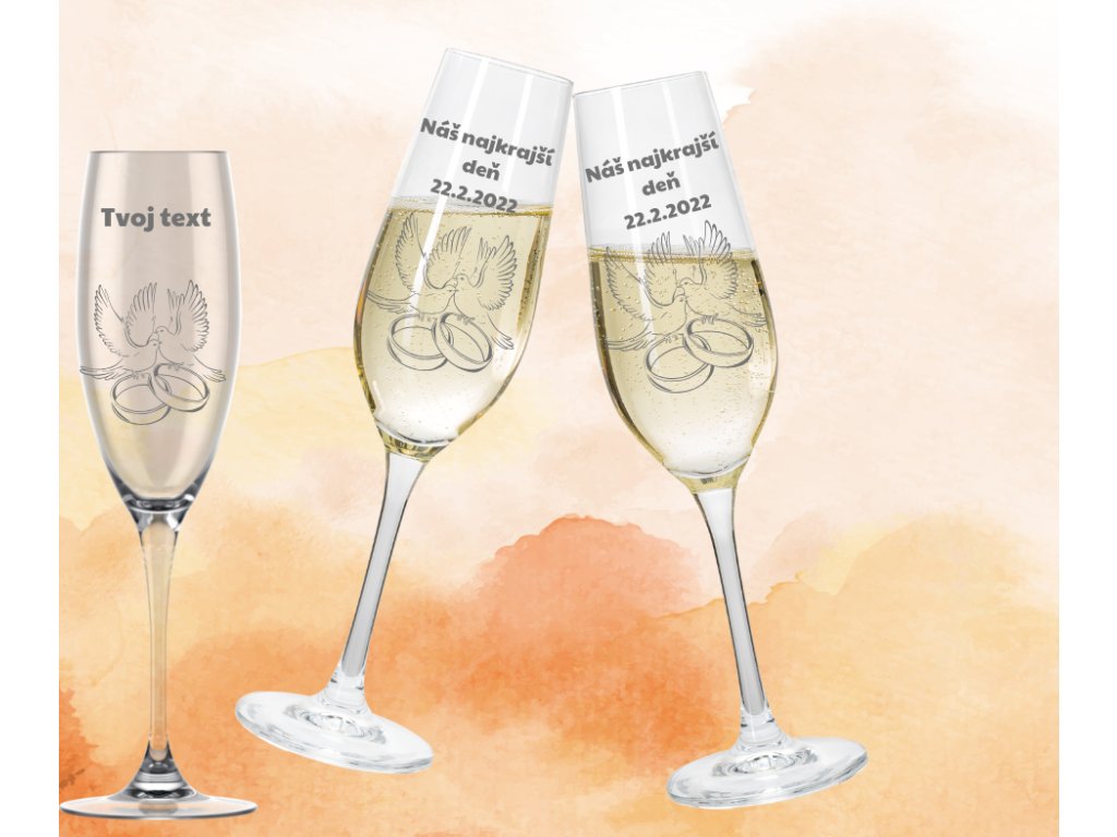 Poháre na šampanské Náš najkrajší deň s vlastným dátumom . Gravírované zabalené v darčekovej krabičke . Text na želanie .